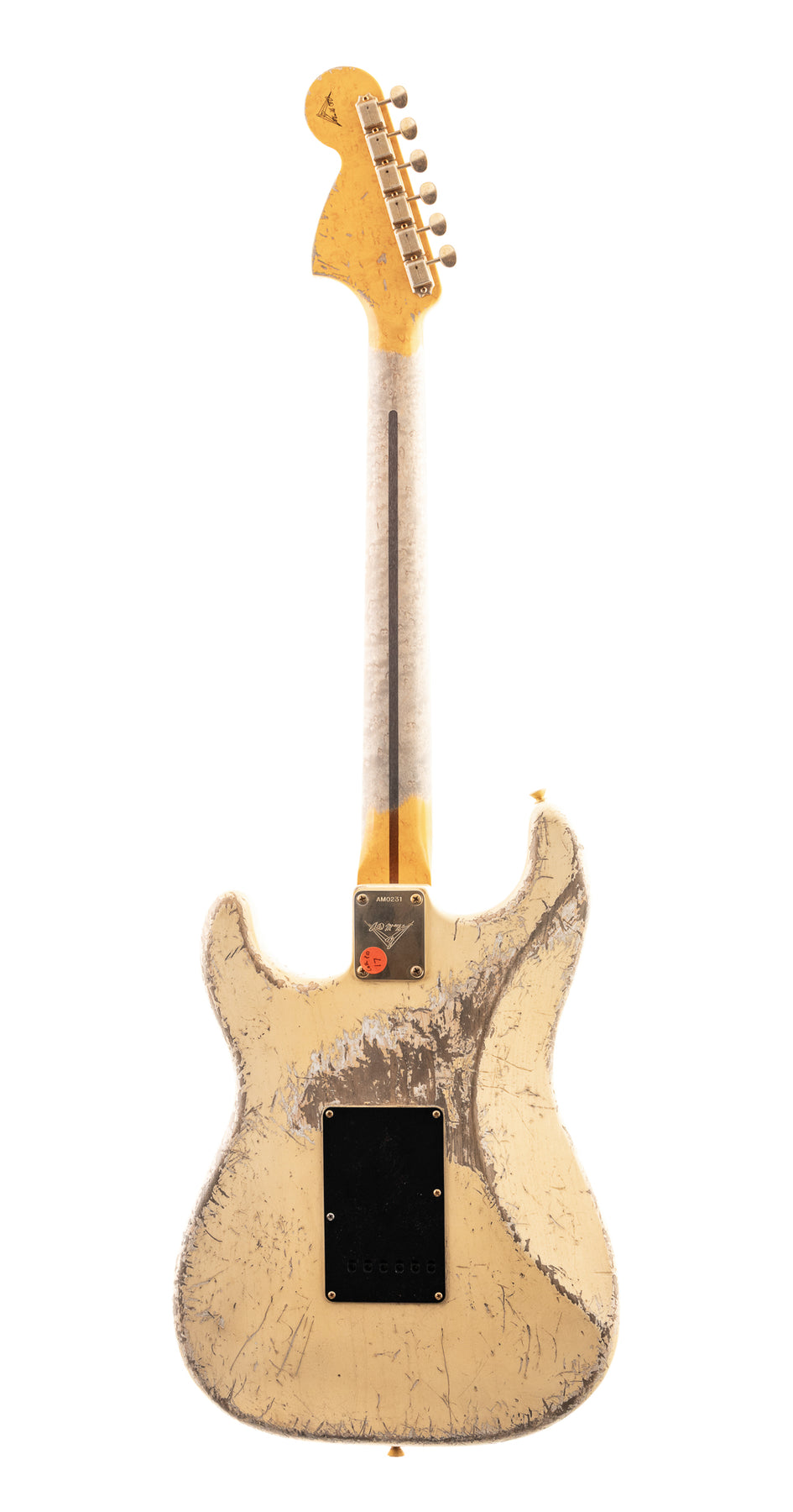 Relic gold hardware, a black white black pickguard, and the large 64 through 67 Strat headstock complete the look of this standout Masterbuilt instrument.