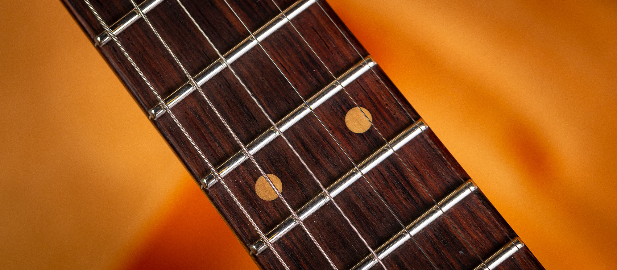 A beautiful Rosewood fretboard sets the stage with contrasting aged clay dots setting the mood for the Dunlop jumbo 6100 frets. Designed for effortless playbility the 9.5" - 12" compound radius allows smooth bends.